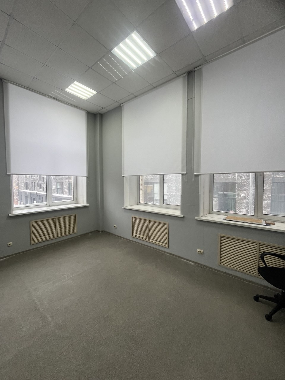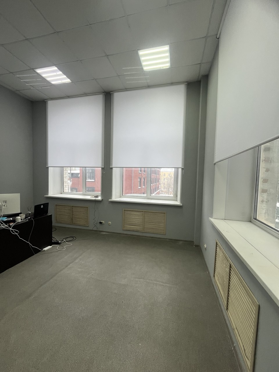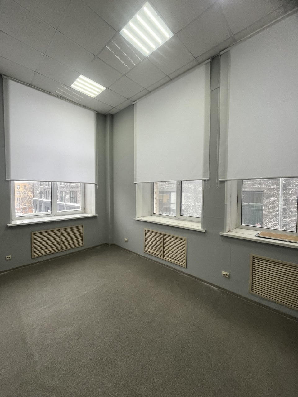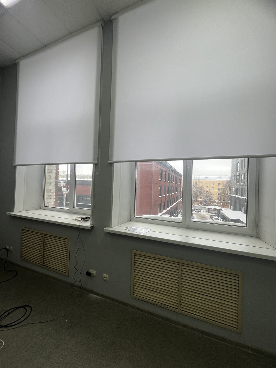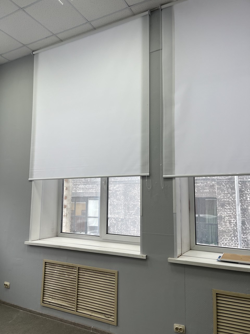 Рулонная штора в кабинет с высокими окнами. Ткань Альфа белая.