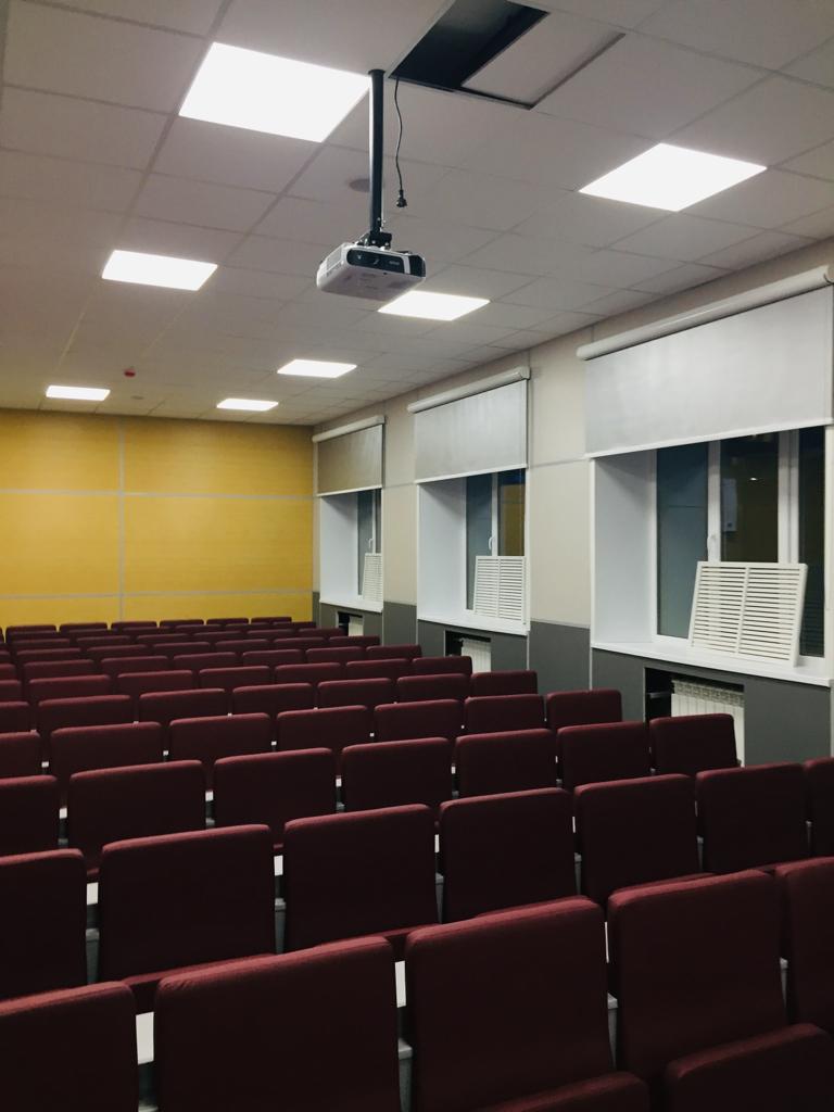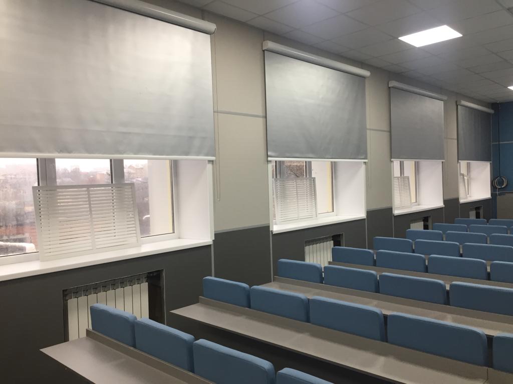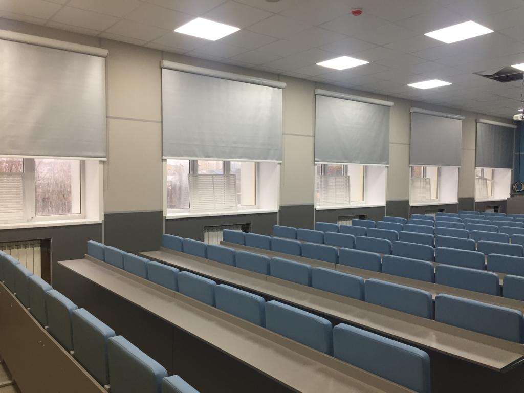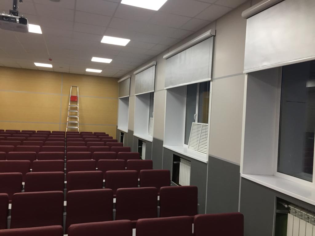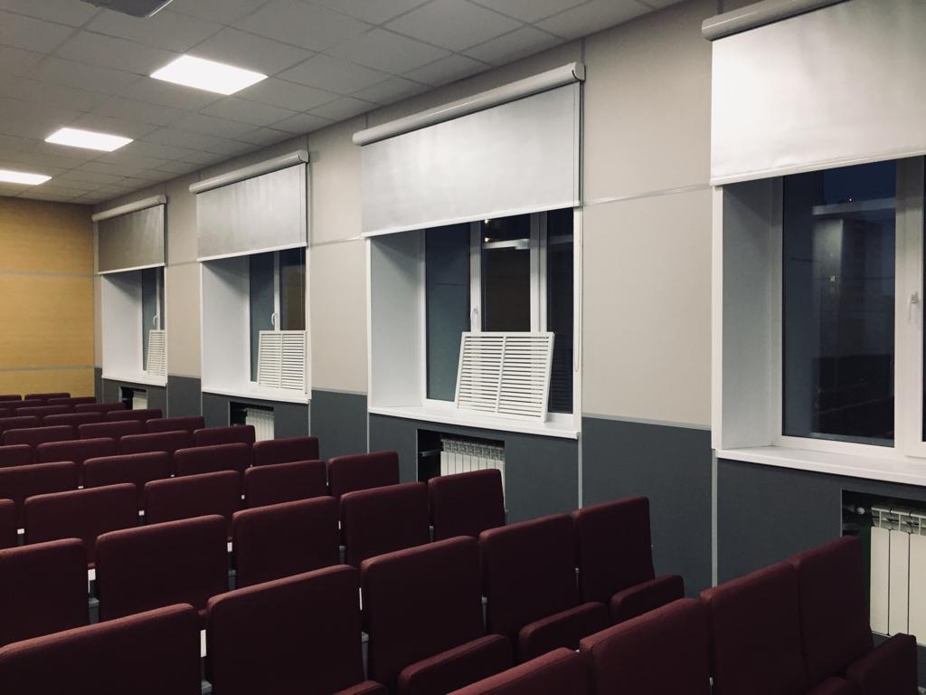 В актовый зал Медучилища требовалось закрыться от света. Были выбраны рулонные шторы блэкаут из ткани с алюминиевым напылением, которая была перевернута напылением налицо. Также для более легкой работы была установлена металлическая цепь.