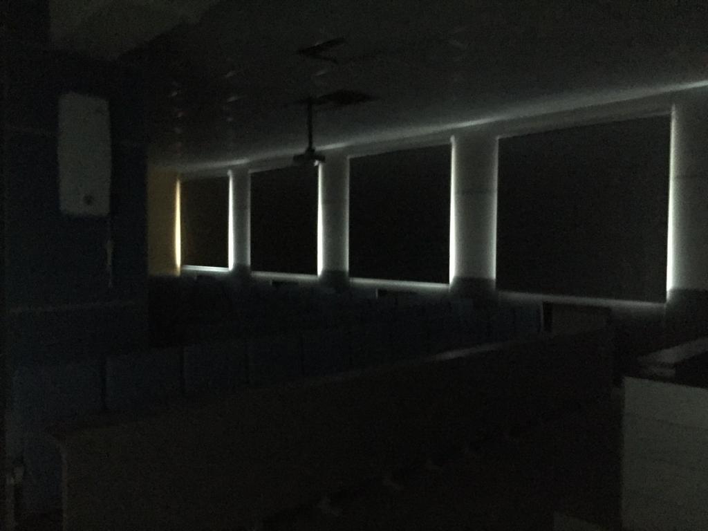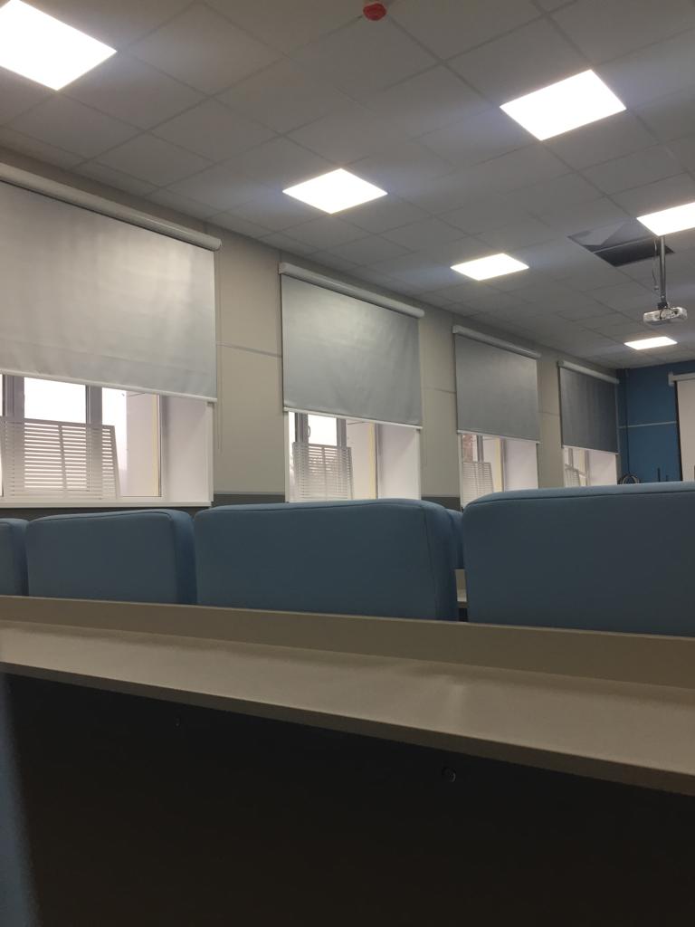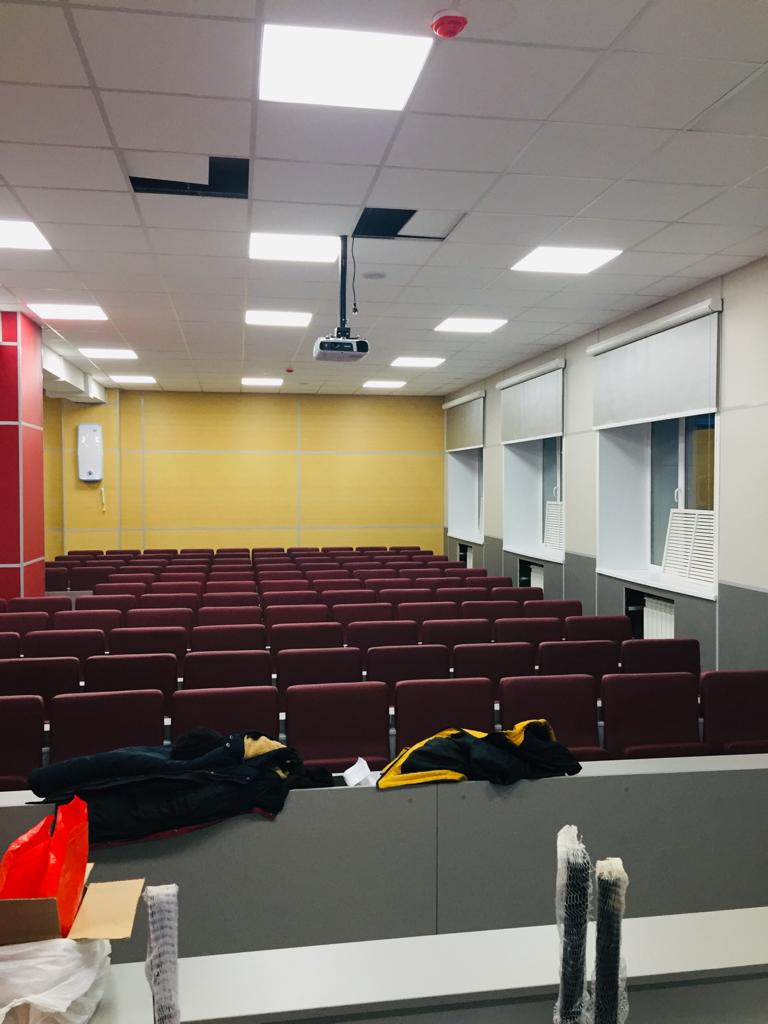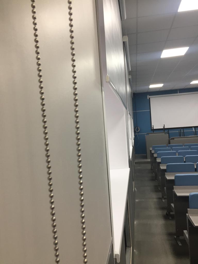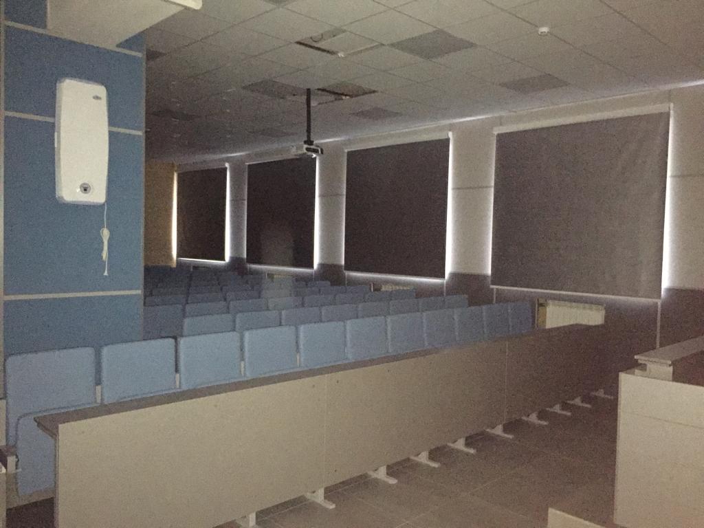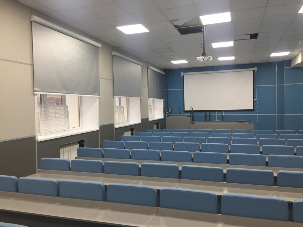 В актовый зал Медучилища требовалось закрыться от света. Были выбраны рулонные шторы блэкаут из ткани с алюминиевым напылением, которая была перевернута напылением налицо. Также для более легкой работы была установлена металлическая цепь.
