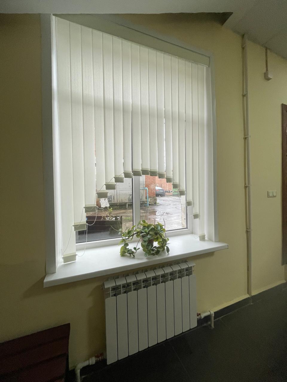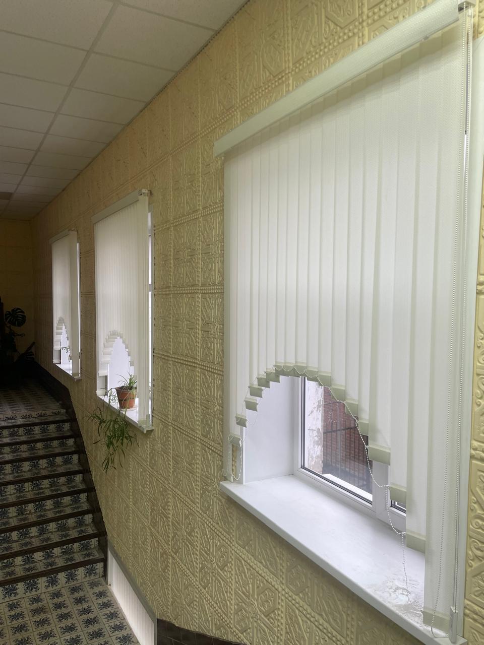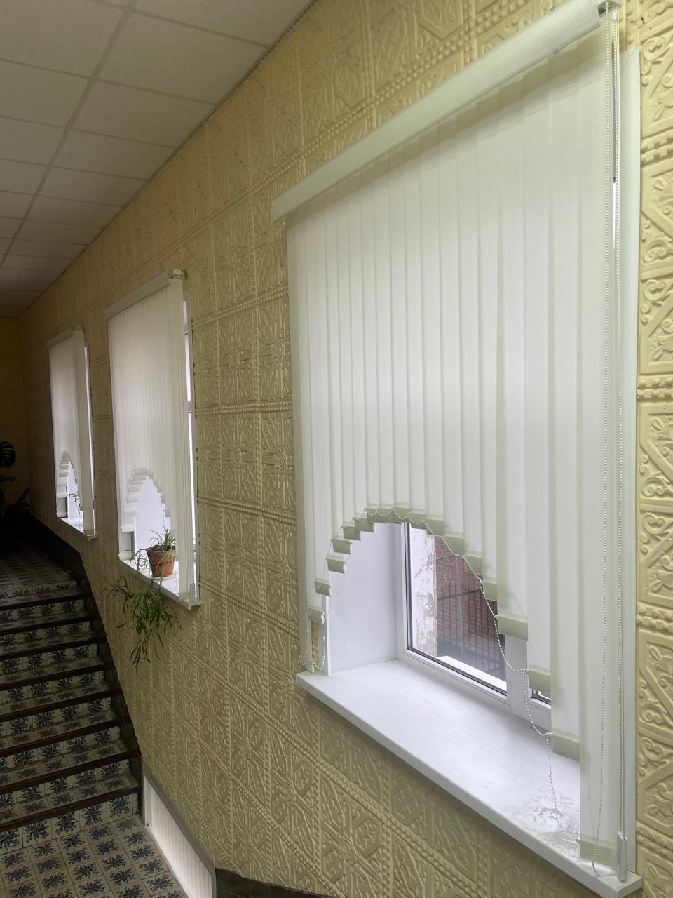 В троллейбусный парк в коридор администрации нужны были вертикальные жалюзи для оформления оконных проемов. Были выбраны вертикальные жалюзи арками из ткани Мальта бежевый.